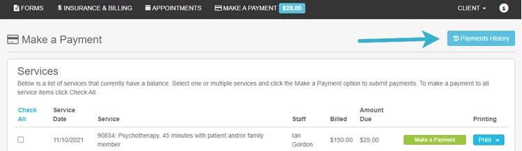 NOTE: If the Make a Payment option is not visible, your Therapist/Organization will have to turn on the payment option. Please reach out to your Therapist if this is the case.