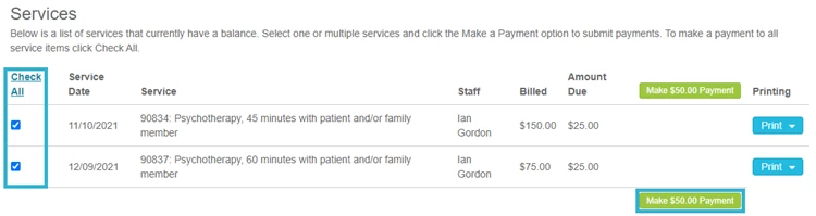 - Click Check All to the left of the services or click Make a Payment to the right of an individual service.