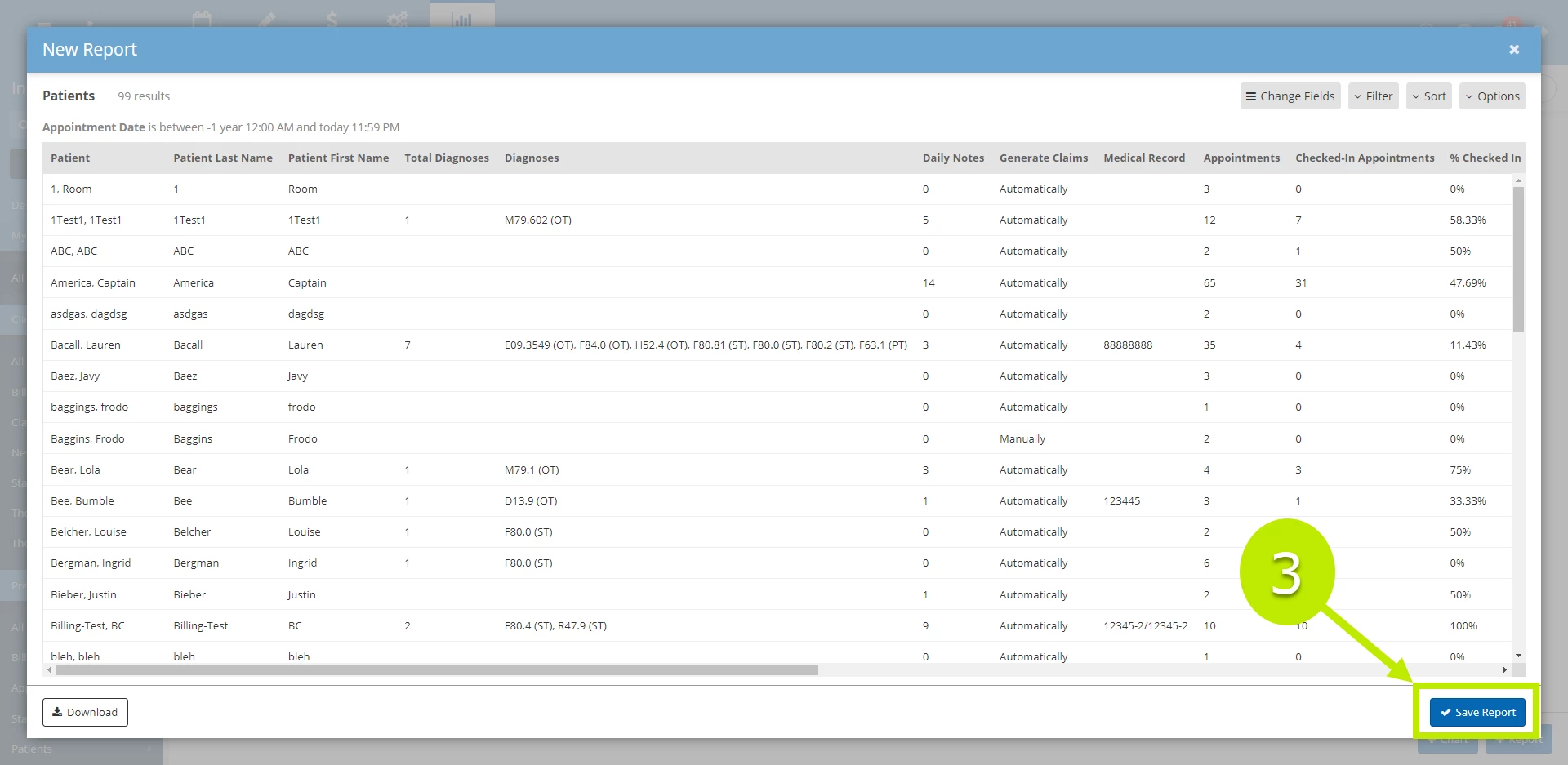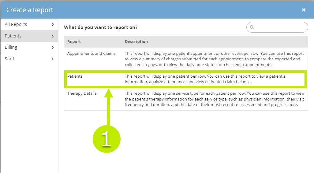 - In the Create a Report window, select Patients and select Patients.