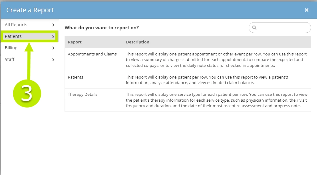 - In the Create a Report window, in the left-hand menu select Patients.