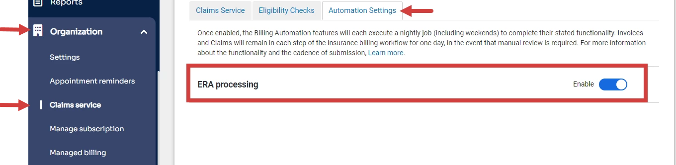 Use the ERA Auto posting feature in the auto-post process to advance claims to the next step in the billing workflow based on the result of the posting so you do not have to do this manually.