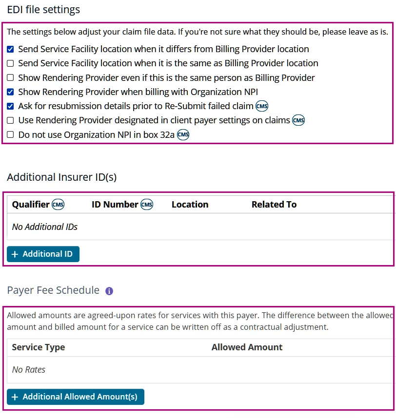 See Set Up EDI File Settings for more information. - Additional Insurer ID(s) for if you have legacy Insurer IDs, you can enter them here. (i.e., Taxonomy Code).
