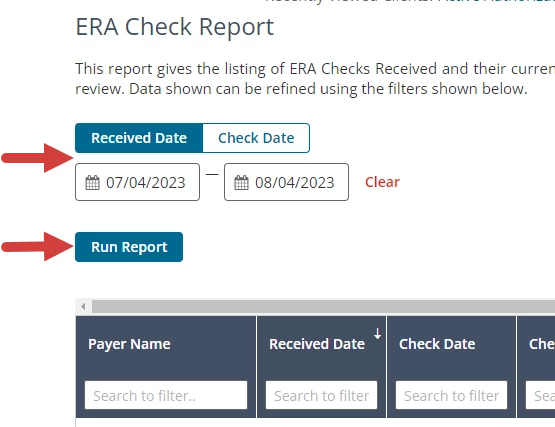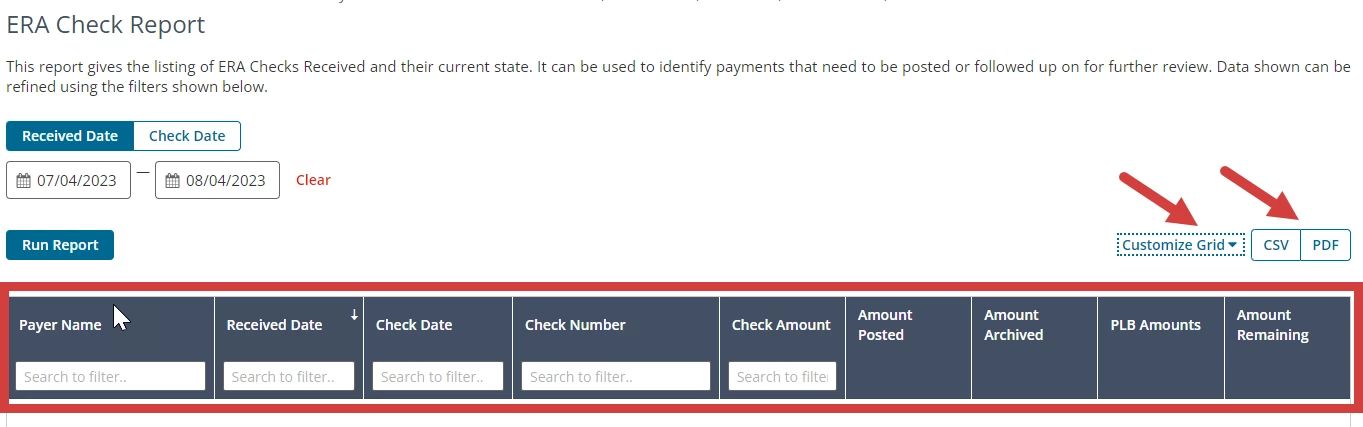 This report gives the listing of ERA Checks Received and their current state. It can be used to identify payments that need to be posted or followed up on for further review. Data shown can be refined using the filters. It can also be customized using the customize grid option.