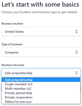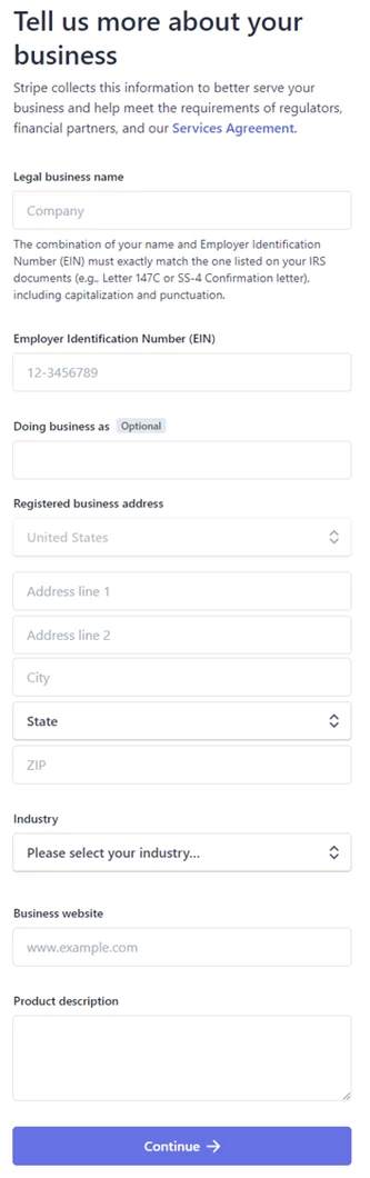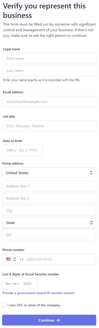 Stripe will ask for specific business and personal information based on what type of business and business structure you selected on the previous screen. Click the link below that matches your business type and structure for a detailed, screen-by-screen guide.