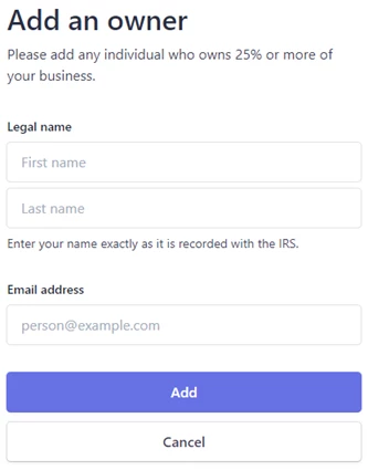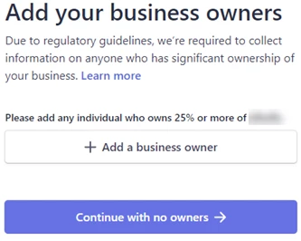 Click Add a Business Owner to add the name of any individual who owns 25% or more of the company, or click Continue With No Owners.