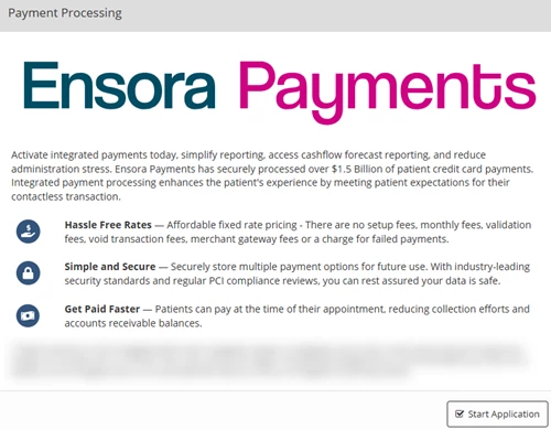 You can complete your Ensora Payments enrollment application from the Add-Ons section within the system. If you started the enrollment process without finishing it, you can return to this screen and click the Continue Application button to complete your application.