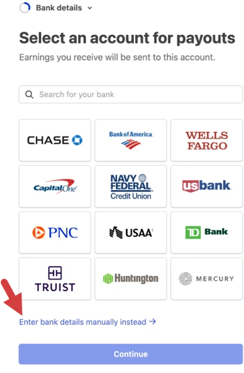 NOTE: The Ensora Payments team recommends that you manually enter your Routing and Account Numbers instead of selecting your bank. If you select the bank, you will be prompted to enter your banking login information (username and password).