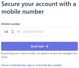 The Stripe enrollment process launches automatically after you complete the Ensora Payments enrollment screen. You will need to have a mobile phone handy in order to receive a text with a verification code. Remember, you must be a business owner or someone with significant management responsibility in the business to complete the enrollment process.