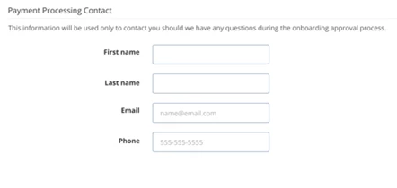 Enter Payment Processing Contact information for Ensora Payments. This information will only be used to reach out to you if there are any questions during the approval process.