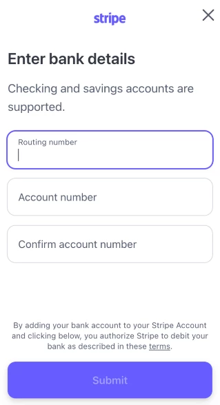 This will be the bank account where stripe will transfer funds. It must be a checking account.