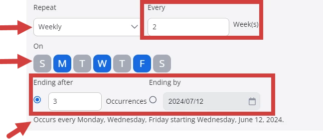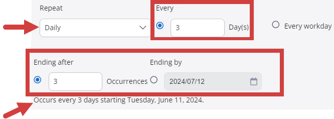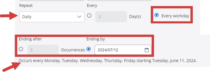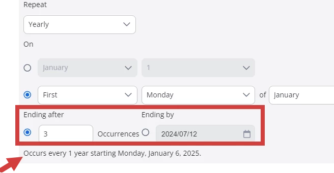 - Select either Ending after and enter number of occurrences or Ending by and enter a date.