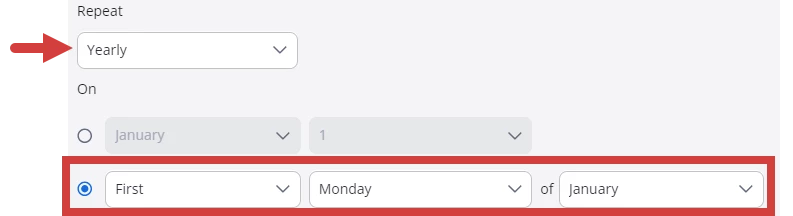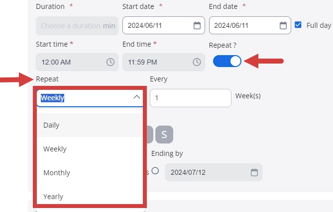 - Select Daily, Weekly, Monthly, Yearly in Repeat field.