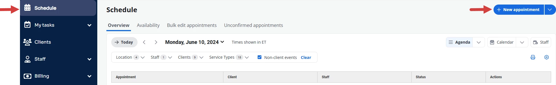 - Click the Schedule tab in the navigation bar. You can also schedule appointments from the Client page. See Schedule Individual Client Appointment for more information.