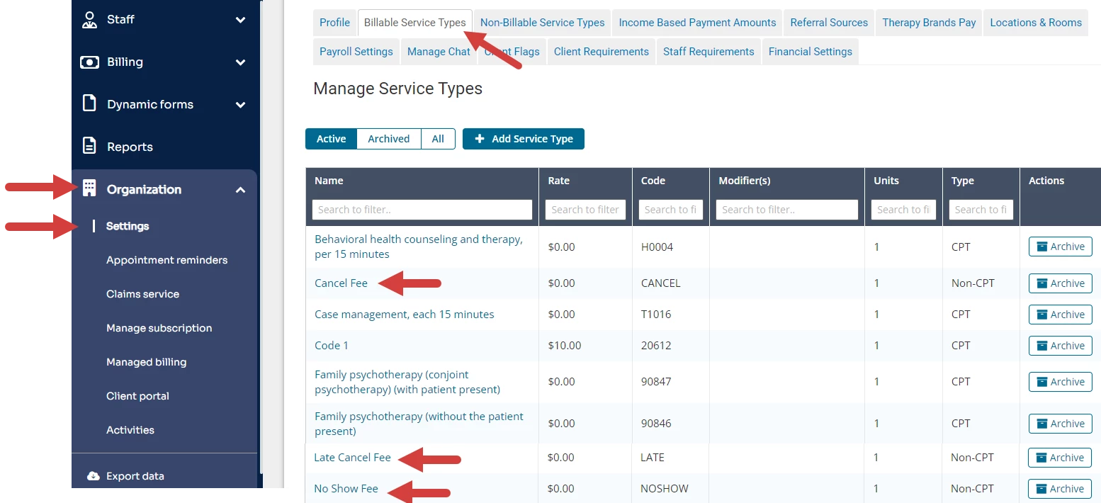 The Cancelation Policy feature allows you to either manually apply a fee to appointments as needed or apply a predetermined fee to all Late Cancel or No-Show appointments utilizing Non-CPT Service Types. With the introduction of this feature, three new Non-CPT Service Types have been added: