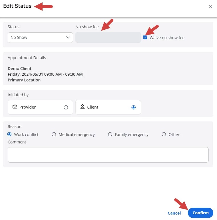 If you have previously configured rates for the Late Cancel Fee, or No-Show FeeService Types, the rate associated with the status selected populate in the Fee field or you can manually add a numerical fee by unchecking the Waive Fee option.