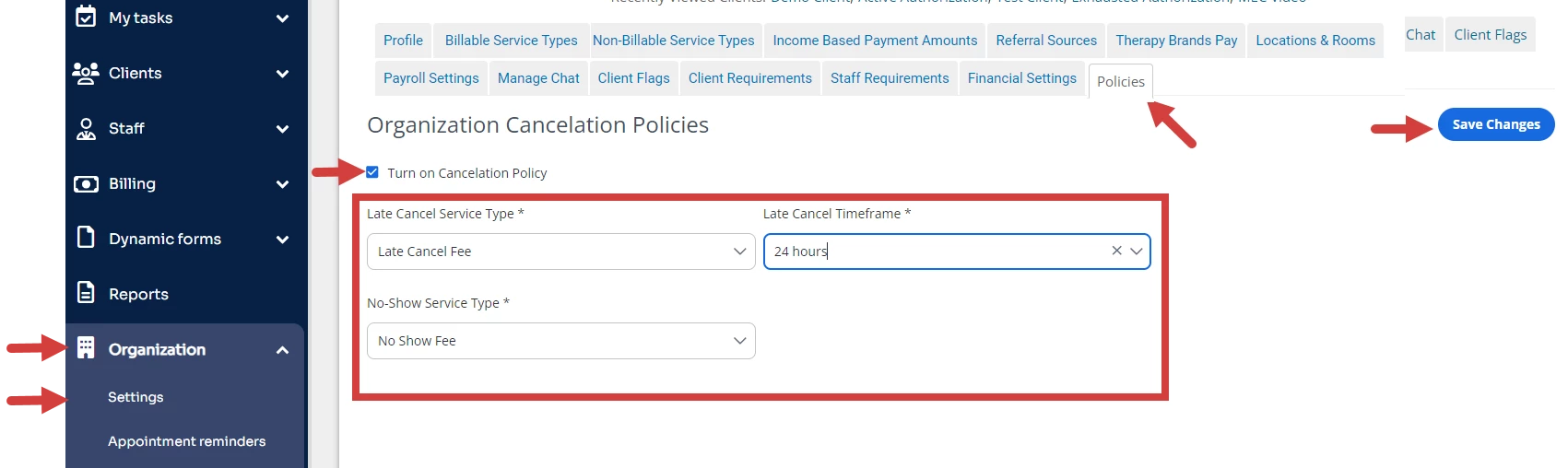 IMPORTANT: After the Cancelation Policy is configured and enabled, all appointments updated to Late Cancel, or No-Show status within Ensora ABA Therapy or canceled via the Client Portal, SMS reminder, or Phone reminder within the configured timeframe will have the corresponding rate applied to any Invoice(s) created for the Appointment.