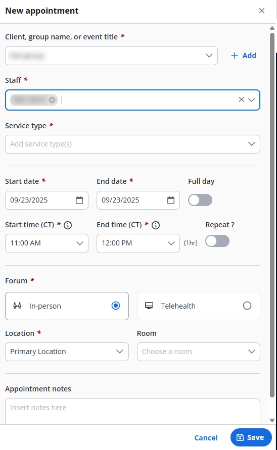 - Click +New appointment or New Telehealth Session (if applicable). The New Appointment window opens. Enter appointment details as explained above.
