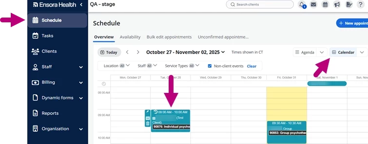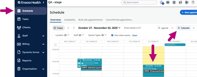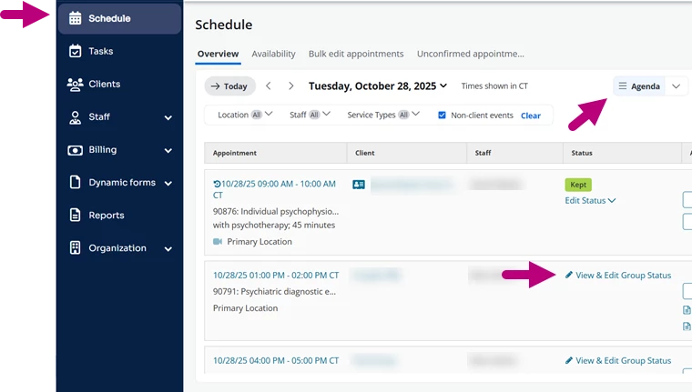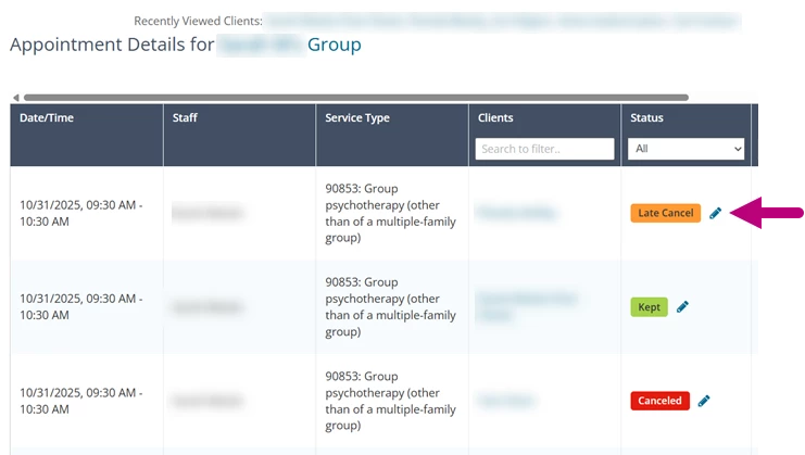 NOTE: Clicking directly on the group name will open the Appointment Details page. From here, you can click the Pencil icon in the status column to open the Edit Appointment window.