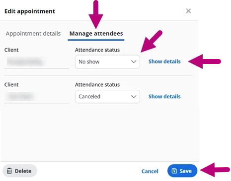 - Click the Edit Status dropdown for the appointment to select a new status and open the Manage Attendees tab on the Edit Appointment window.