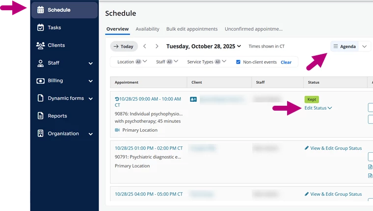 Appointment Status is a way to help categorize and keep track of Appointments. Staff Members can change the status from the Agenda, Calendar or a Client's Appointment History Report. Clients can also change the Appointment Statuses to cancelled when they respond to an Appointment text reminder or through the Client Portal. See Organization Cancellation Policies - Overview for more information.