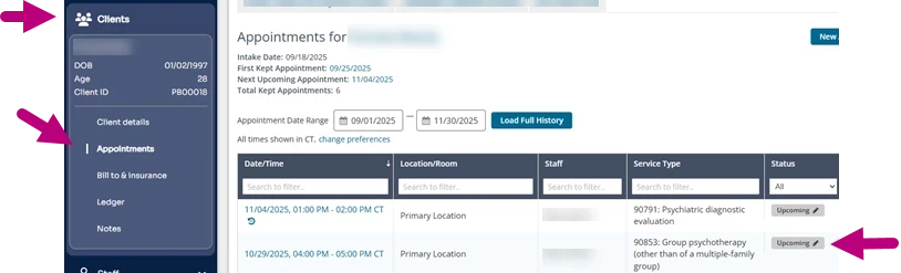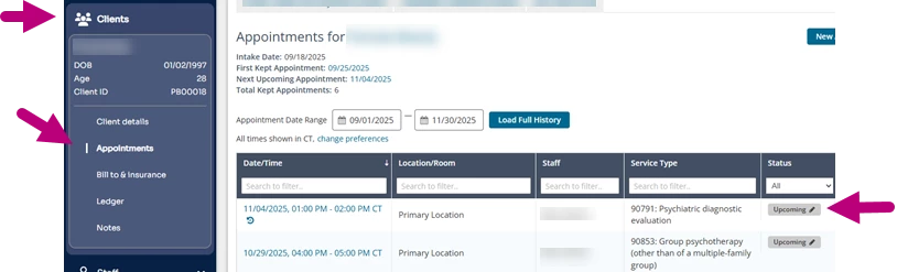 - You can select Upcoming, Kept, Canceled, No Show, Late Cancel & Rescheduled.