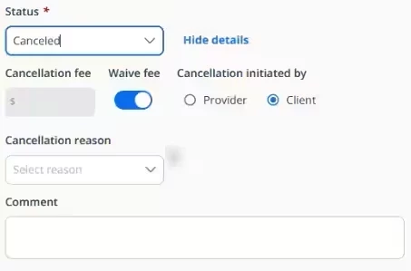 - Click Show Details to add or waive a fee for the client, indicate who initiated the status change (Provide or Client), select a reason for the change or add a comment.