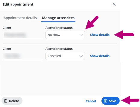 - Click the Pencil icon in the status column to select a new status and open the Manage Attendees tab on the Edit Appointment window.