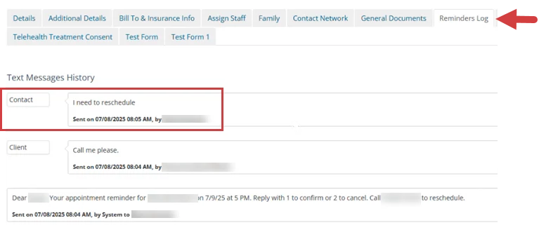 The Reminders Log shows a history of reminders sent to both clients and their contacts, including the names of recipients and any responses received.