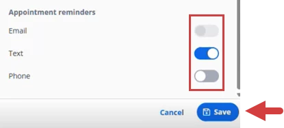 - Click the toggles to turn on Email, Text, and Phone appointment reminders.