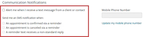 Manage your communication notifications under the Preferences tab in your Profile. You can also opt to receive an alert in the system when you receive a text message from a client or client contact.