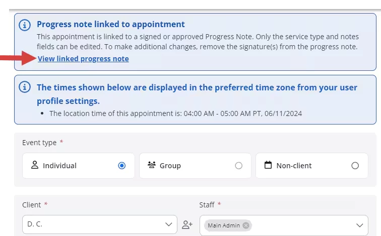 - If the Note belongs to an individual Client Case, the Appointment must be an individual (not group) Appointment for the same Client.