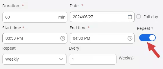 - Select Duration, Date, Start/End times & Repeat setting (if applicable). See Schedule Client Appointment and Client Appointment Variations for more information.