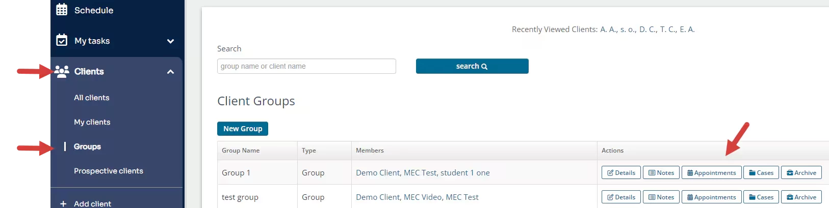 - Find your Group and click Appointments in the Actions column.