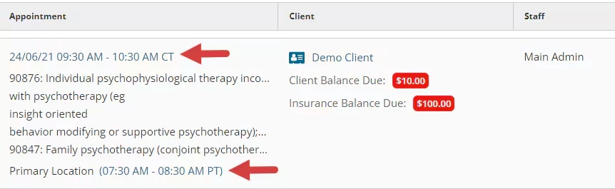 NOTE: Staff members have the ability to set a default time zone that is different from organization & location time zones. For the associated staff, their agenda, calendar & appointment windows will then display in the time zone set by the staff member. Appointment times will display in the location time zone on the client list and signed documentation. See Set Your General Preferences for more information.