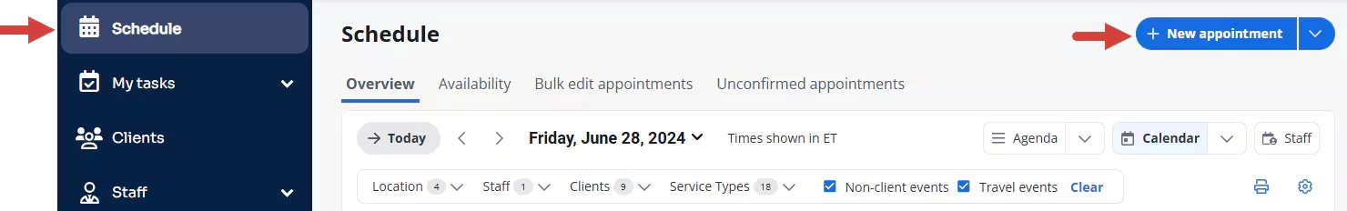 - Create a new appointment from the Schedule or Clients page as described above.