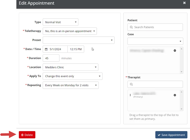You can delete an appointment if there are no associated documents and no patients have been checked-in. Teletherapy appointments can no longer be deleted once someone has joined the session.