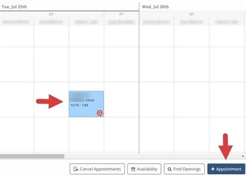 - In the lower right, click the + Appointment button, or click on an existing appointment to open that appointment. You can also click and drag on the calendar to schedule an appointment for that user and those time slots.