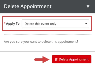 - In the Apply To field, select Delete this Event Only, or Delete All Remaining Events in the Series. This option will only display if the appointment is part of a series.