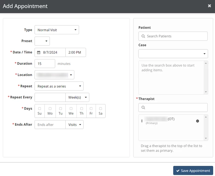 Type: Indicates whether this appointment is for a normal visit, initial evaluation, re-assessment, discharge, or progress note. A document of the selected type will automatically be created when the patient is checked in.
