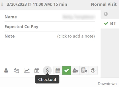 - From your Schedule, hover over your patient's appointment and click the $ Checkout icon.