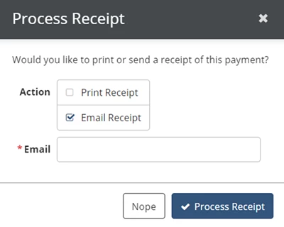 - If you want to print or email a receipt, select the desired options and click the Process Receipt button. Otherwise, click the Nope button.