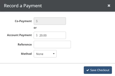 | Co-Payment | The amount of the co-payment made by the patient. Co-payments are attached to claims and are not applied to a billing account until the claim is finalized. If a co-payment is entered, the checkout icon will turn green. |