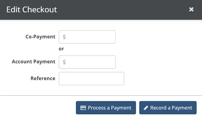 When you check out your patient, you have the option to either Process a Payment or Record a Payment for your patient. Use the Process a Payment option to process a patient's payment method within the system. Use the Record a Payment option to save information about a cash payment or payment that was made outside of the system.