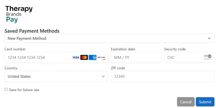 - Select a Saved Payment Method or select New Payment Method. If you select New Payment Method, fill in the Card Number, Expiration, CVC, Country and Zip fields. Select the Save for Future Use checkbox to save this payment method for the patient.