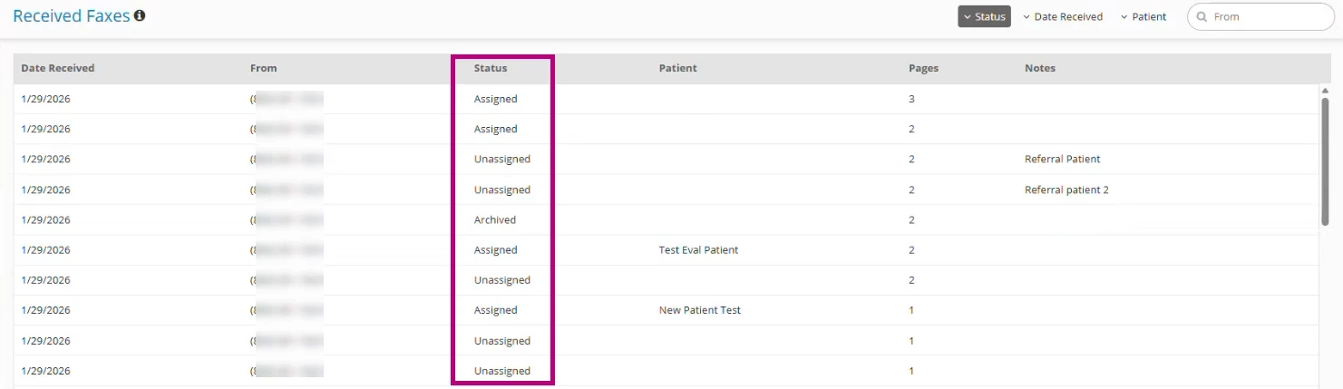 - Unassigned: The fax has been received but is not linked to a patient.