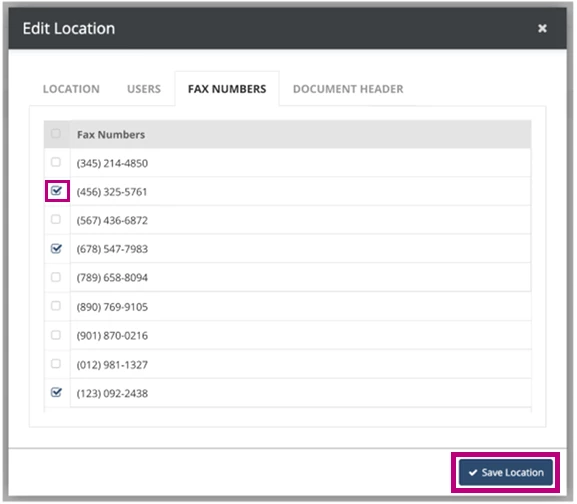 - Select the fax number(s) to assign to the location.