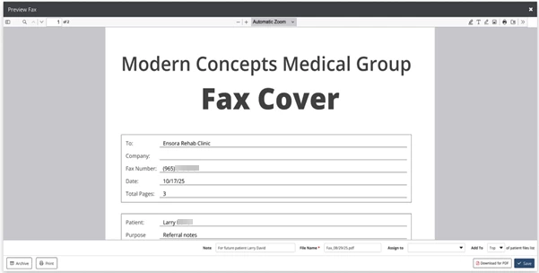 The system supports inbound faxing through integration with Interfax. Clinics can receive faxes directly in the system and manage them from a centralized fax management experience.