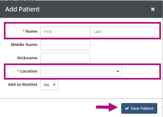 - Enter the required fields (First Name, Last Name, and Location) and Click Save Patient.