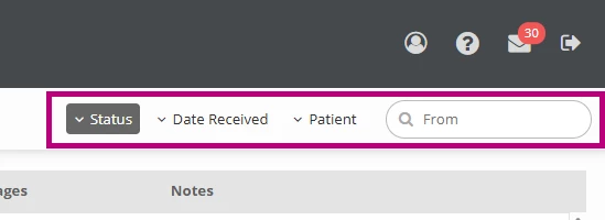 The fax management window includes search and filter options to help locate specific faxes. Faxes can be filtered by Status, Date Received, or Patient.