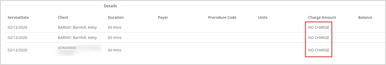 2. The No Charge amount can be verified by viewing the Details of the Create Charges job that processed these services.